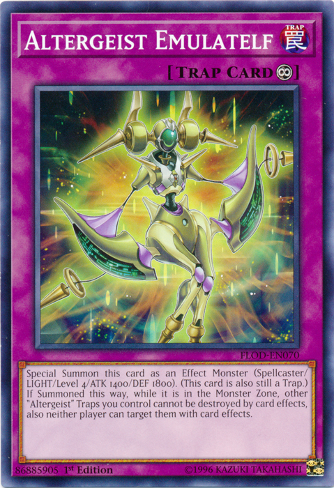 Special Summon this card as an Effect Monster (Spellcaster/LIGHT/Level 4/ATK 1400/DEF 1800). (This card is also still a Trap.) If Summoned this way, while it is in the Monster Zone, other "Altergeist" Traps you control cannot be destroyed by card effects, also neither player can target them with card effects.